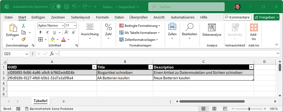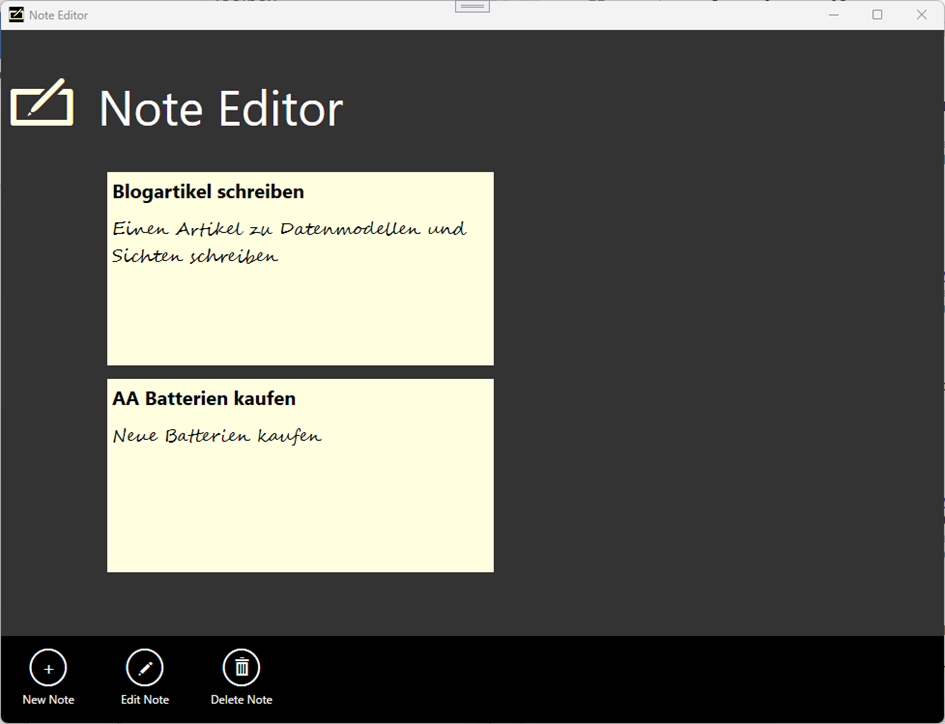 <?xml version="1.0" encoding="utf-16"?> <Notes xmlns:xsi="http://www.w3.org/2001/XMLSchema-instance" xmlns:xsd="http://www.w3.org/2001/XMLSchema"> <Note> <GUID>cf285893-9d56-4a86-a9c8-b7662edd924b</GUID> <Title>Blogartikel schreiben</Title> <Description>Einen Artikel zu Datenmodellen und Sichten schreiben</Description> </Note> <Note> <GUID>2f0d918b-9127-4fb0-b5b1-31d7a1e5f8a4</GUID> <Title>AA Batterien kaufen</Title> <Description>Neue Batterien kaufen</Description> </Note> </Notes> |