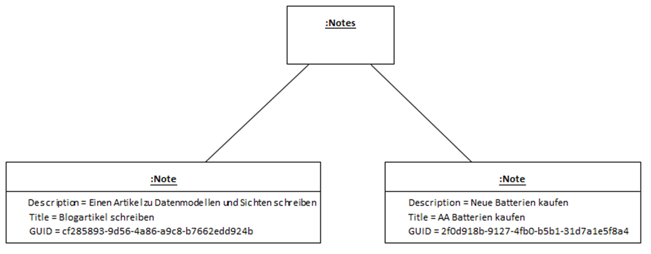 Mit Hilfe dieses Datenmodells lassen sich nun Datenobjekte bilden. In Abbildung 3 sind Beispieldaten von 2 Notizen als UML-Objektmodell zu sehen. Dieses UML-Modell mit seiner Darstellung der Objekte mit Hilfe des Objektdiagramms ist bereits eine Visualisierung von Daten und damit bereits auch eine Sicht auf die Daten.