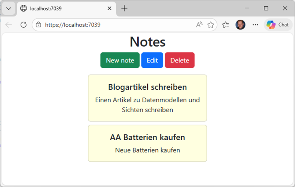 { "notes": [ { "guid": "cf285893-9d56-4a86-a9c8-b7662edd924b", "title": "Blogartikel schreiben", "description": "Einen Artikel zu Datenmodellen und Sichten schreiben" }, { "guid": "2f0d918b-9127-4fb0-b5b1-31d7a1e5f8a4", "title": "AA Batterien kaufen", "description": "Neue Batterien kaufen" } ] } |