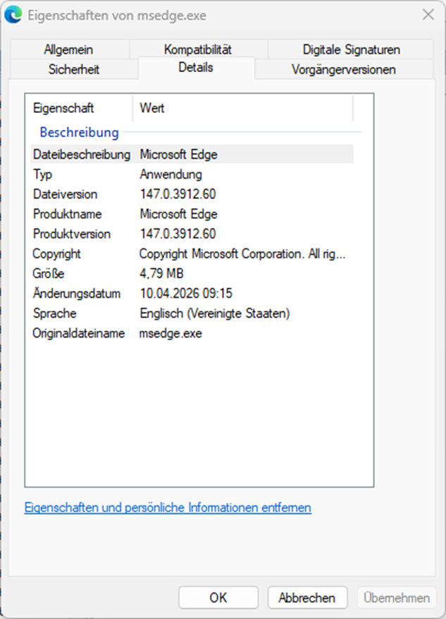 Wenn es sich um eine Windows-Anwendung handelt, dann besteht diese aus ausführbaren Dateien (EXE = executable) und genutzen Bibliotheken (DLL = Dynamic Linked Library). Schaut man sich die Eigenschaften einer solchen Datei mit Windowss-Boardmitteln an, dann sieht man, dass in einer solchen Datei eine Reihe von Informationen stecken, die hilfreich für die Erstellung einer SBOM sein könnten (Abbildung 2).