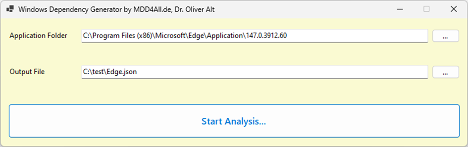 Um den Code möglichst einfach nutzbar zu machen, habe ich eine kleine grafische Benutzeroberfläche mit Windows Forms realisiert. Abbildung 3 zeigt die Anwendung. Hier lässt sich der Ordner auswählen, in dem sich die Anwendungsdateien befinden. Außerdem der Zielordner für die Analyseergebnisse.