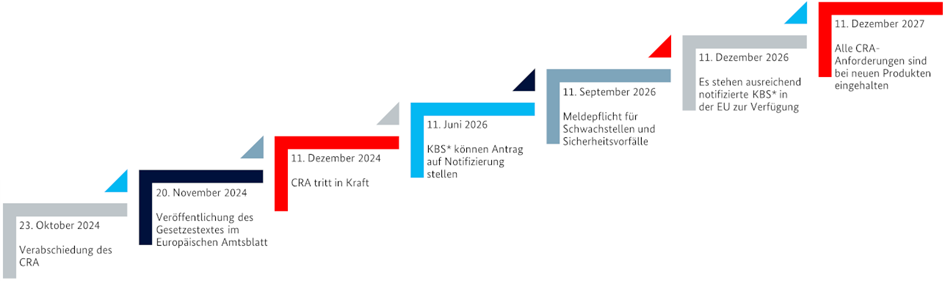 Der Cyber Resiliance Act (CRA) ist eine EU-Verordnung für Mindestanforderungen an vernetzte Produkte mit Softwareanteil, die darauf abzielt diese Art von Produkten widerstandsfähig gegen zum Beispiel Cyberangriffe zu machen. Der CRA wurde am 23. Oktober 2024 verabschiedet und die darin definierten Anforderungen müssen schrittweise immer weiter erfüllt werden. Ende 2027 müssen spätestens alle Anforderungen bei neuen Produkten eingehalten werden. Abbildung 1 zeigt die Meilensteine bei der Umsetzung des CRA.